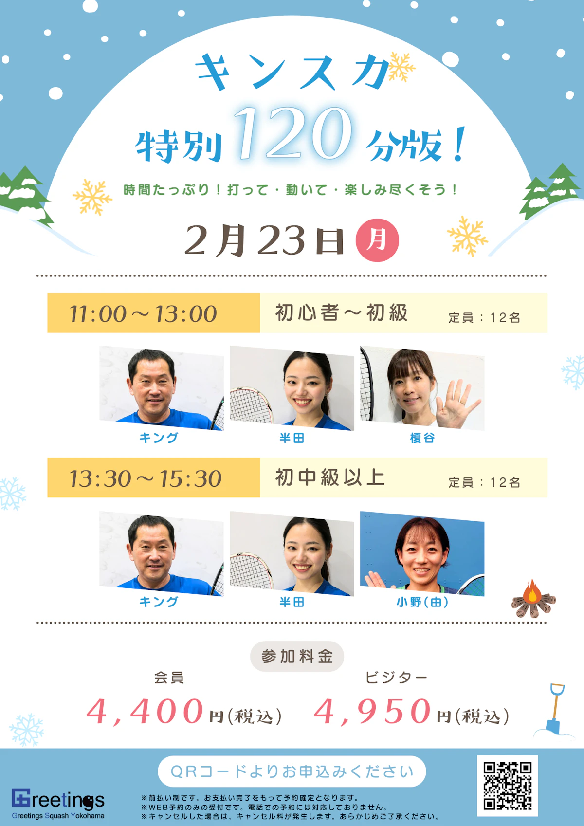 ※天災や交通機関による事情、担当コーチの事情などによりプログラムがクローズになった場合はキャンセル料は発生いたしません。