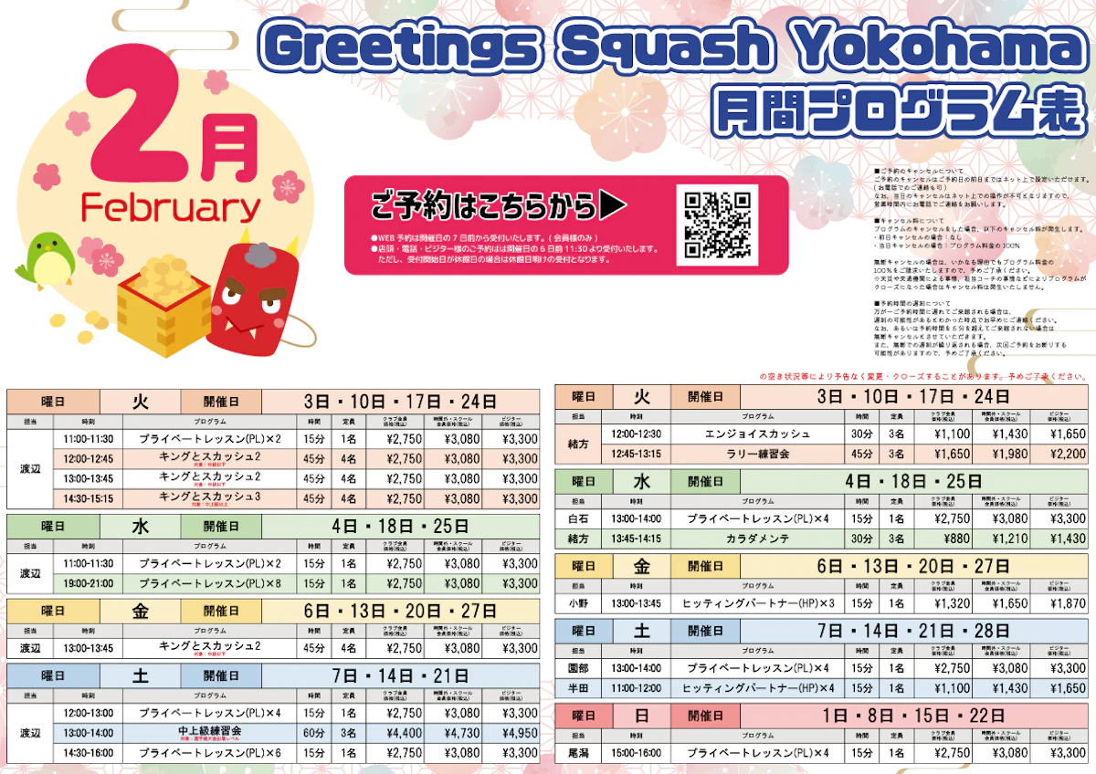 Greetings Squash Yokohama 2月月間プログラム表