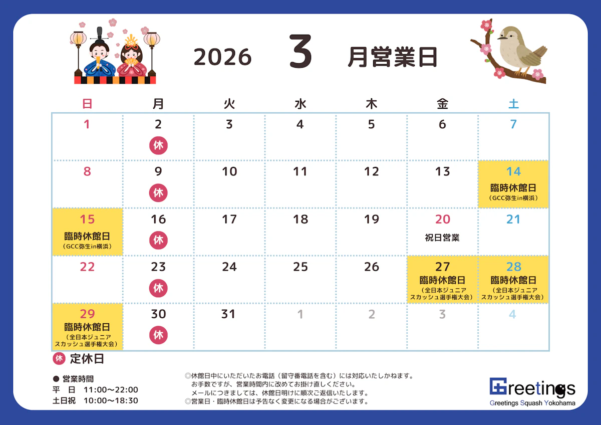 3月休館日のお知らせ