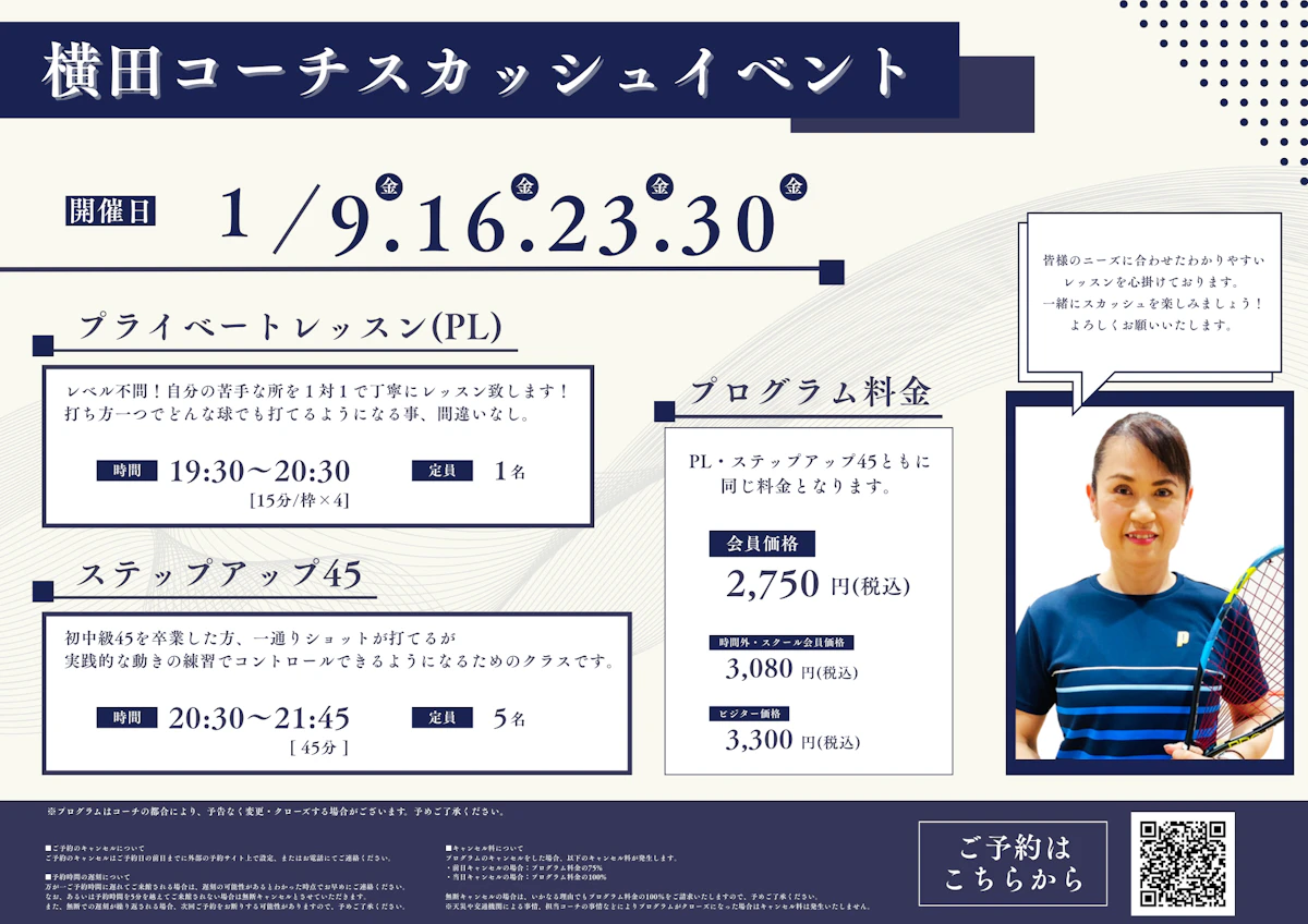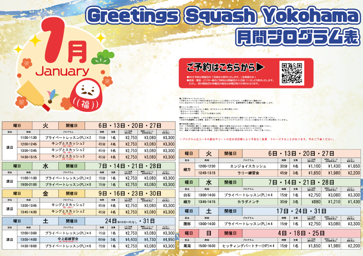 Greetings Squash Yokohama 1月月間プログラム表